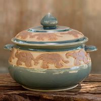 Handcrafted Blue Thai Celadon Covered Bowl 'Blue Elephant Walk' Item ID: 2671801989