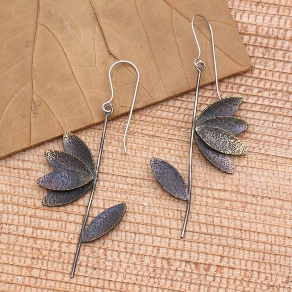 "Inspired by autumn's brown fallen foliage, these earrings recall a walk in the woods. Agus Suryanto creates delightful leaves in textured clusters on slender rods. The beautiful brass receives a darkened finish that adds to the allure. They sway on long, stainless steel hooks."