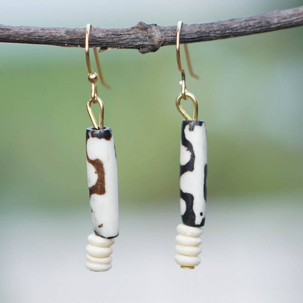 "Wear Ghana's traditional and bold luxury with Tina Quaye's newest design. Made in honor of these charming lands' classic accents, the artisan uses cow bone beads in a natural palette of ivory and brown hues, creating a unique pair of dapper allure. In addition, the earrings-titled Yijiemor, meaning 'praises' in the Ga language-dangle from brass hooks, allowing comfortable use."