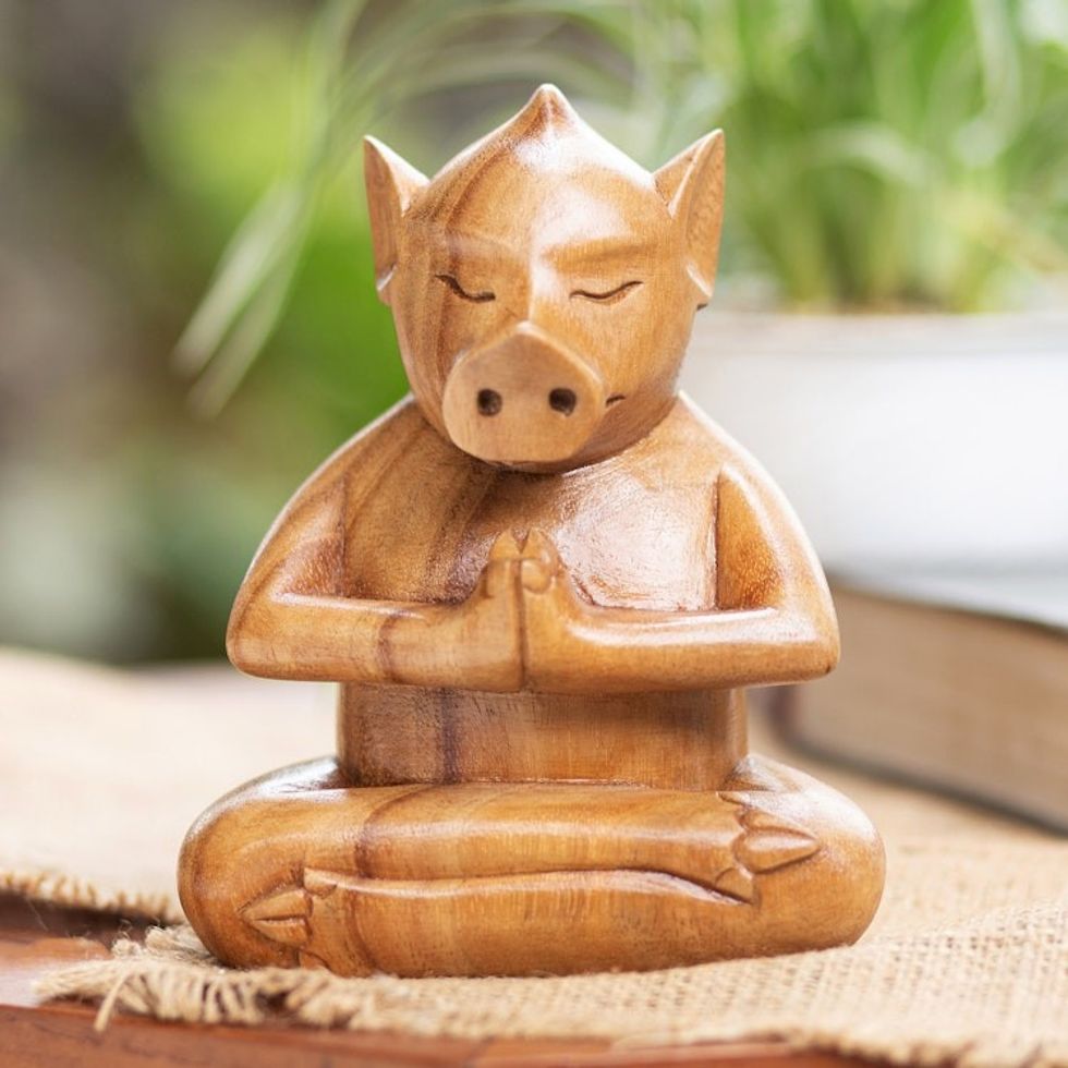 Handcrafted Brown Suar Wood Pig Statuette from Bali 'Gentle Apprentice' Item ID: 2671763143