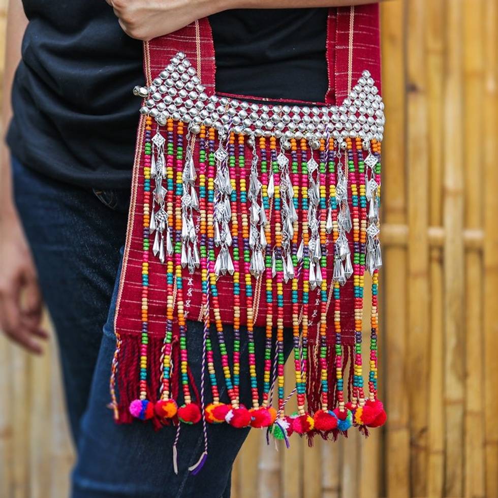 Handcrafted Burgundy Cotton Shoulder Bag with Colorful Beads 'Sunset Customs' Item ID: 2671797766