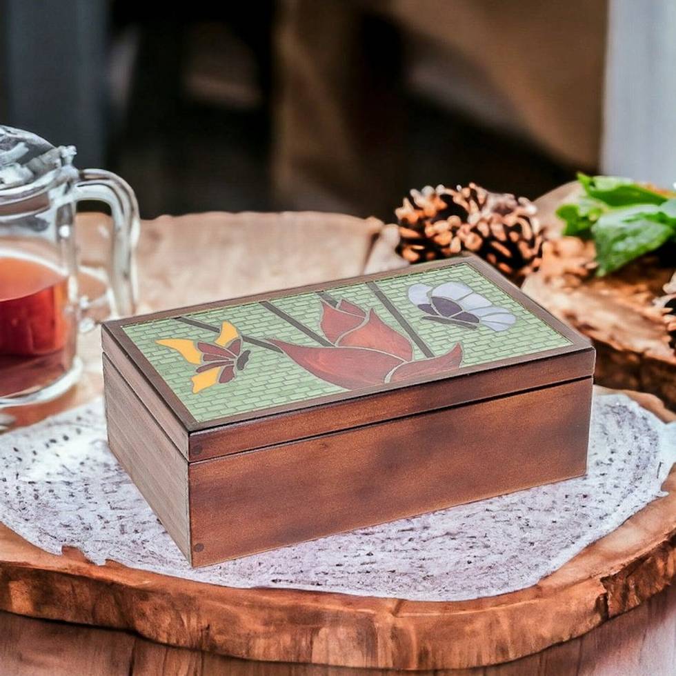 Handcrafted Butterfly-Themed Pinewood Tea Box in Brown 'Fluttering Visions' Item ID: 2671771456