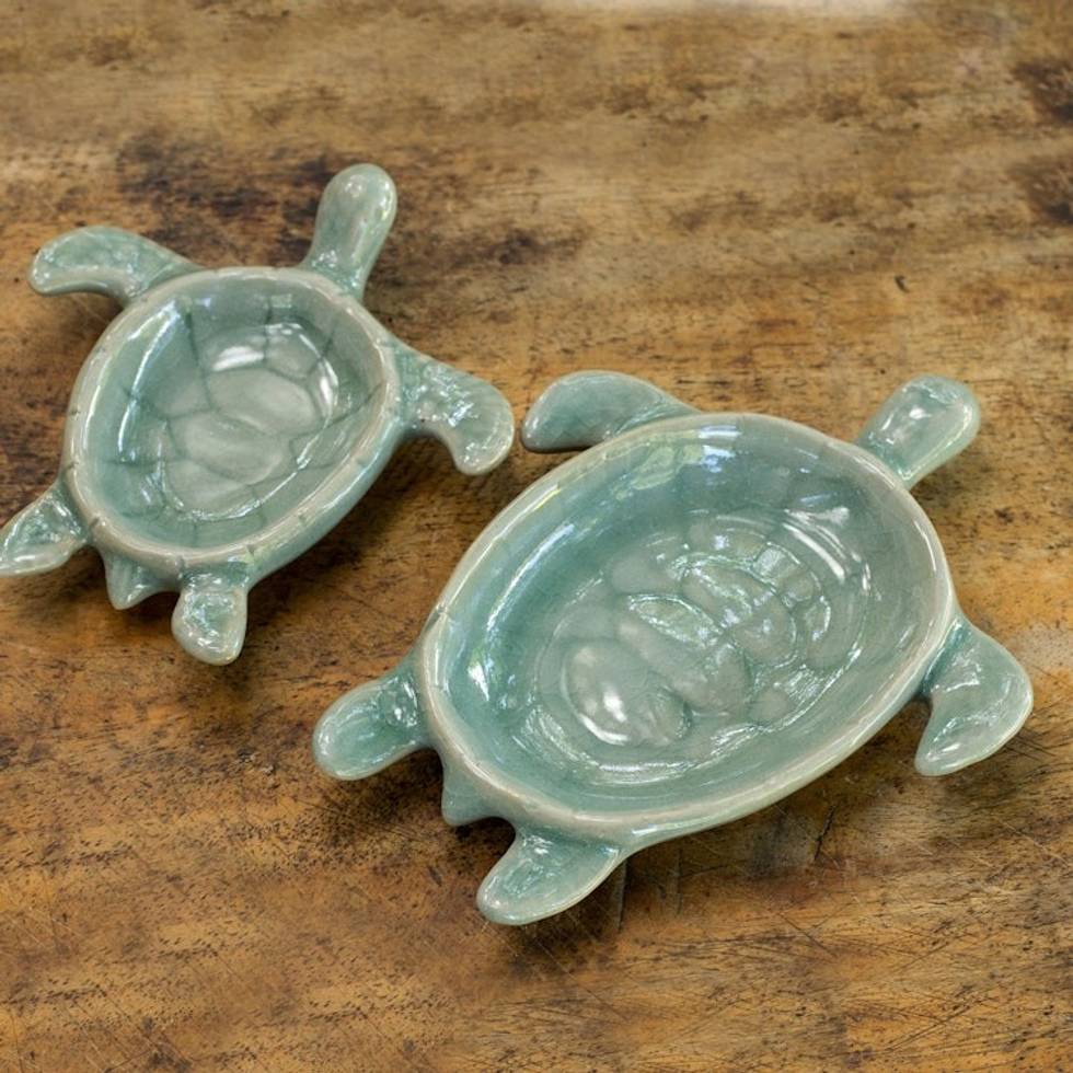 Handcrafted Celadon Ceramic Bowls from Thailand pair 'Aqua Thai Turtles' Item ID: 2671640912