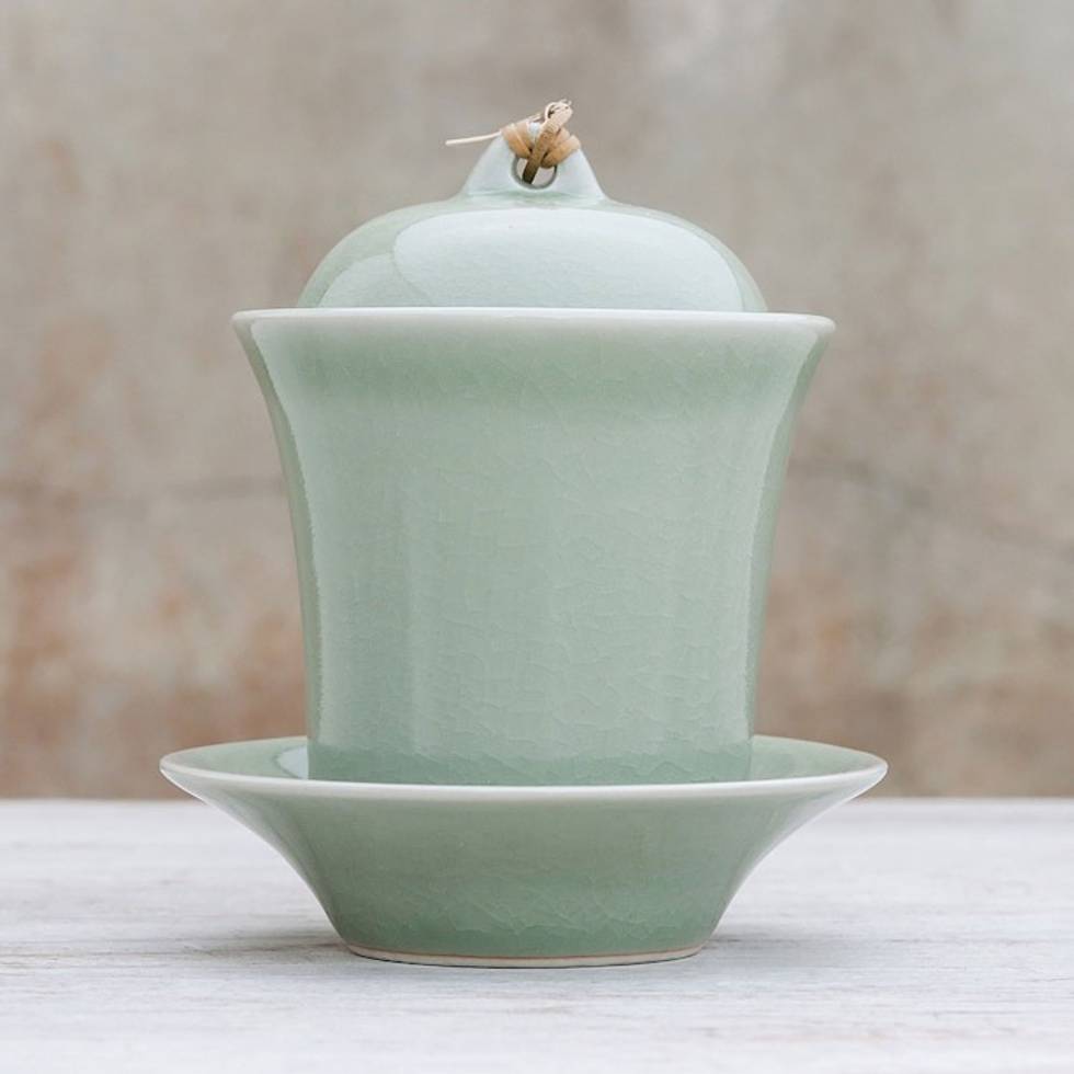 Handcrafted Celadon Green Ceramic Soup Cup Lid Saucer Set 'Cup of Comfort in Green' Item ID: 2669897508