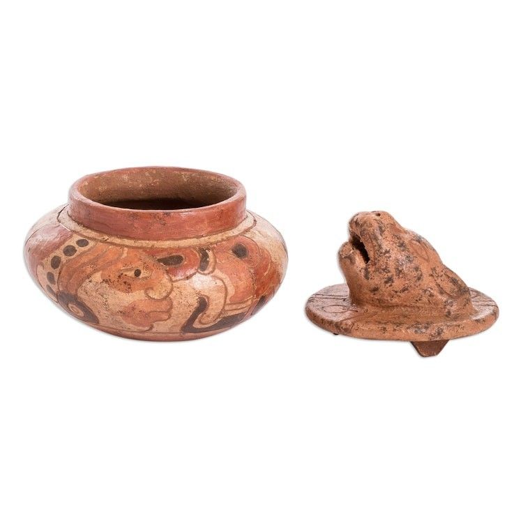 "Oscar Rodolfo Mendoza celebrates the art of the ancient Maya with the original design of this ceramic bowl. Decorated with the head of a jaguar on the lid and human glyphs on the body, the bowl is crafted by hand with the same ceramic techniques developed by the Maya Pibil people. Little is known about them, other than that the Pibil were a warrior and migrant community that came to El Salvador from Mexico. This bowl is treated to achieve an antiqued look, featuring red and orange hues obtained from achiote seeds."
