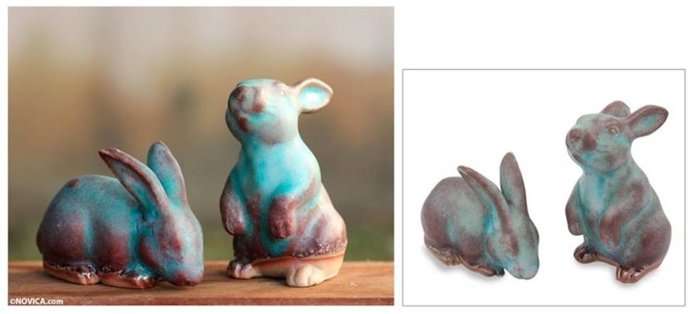 Handcrafted Ceramic Rabbit Figurines in Turquoise pair 'Joyful Rabbits' Item ID: 2671802867