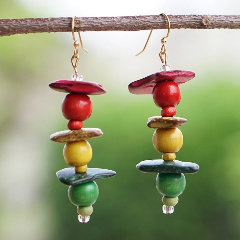 Handcrafted Coconut Shell and Wood Beaded Dangle Earrings 'Lights of Joy' Item ID: 2671804290