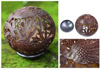 "Preening peacocks flaunt their elegant plumage in this sculpture by Putra Suteja. Keeping her late husband's artisan heritage alive, Eka removes the husk from a coconut shell and polishes the piece to a sheen before carving the images. Beautiful and original, it stands on an albesia wood base.
