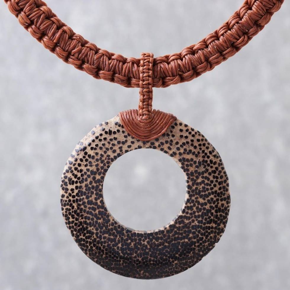 Handcrafted Coconut Wood and Leather Cord Pendant Necklace 'Earth Ring in Burnt Sienna' Item ID: 2671799180