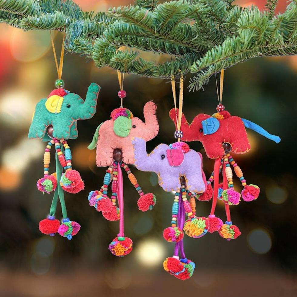 Handcrafted Cotton-Blend Elephant Ornaments Set of 4 'Pompom Parade' Item ID: 2669894155