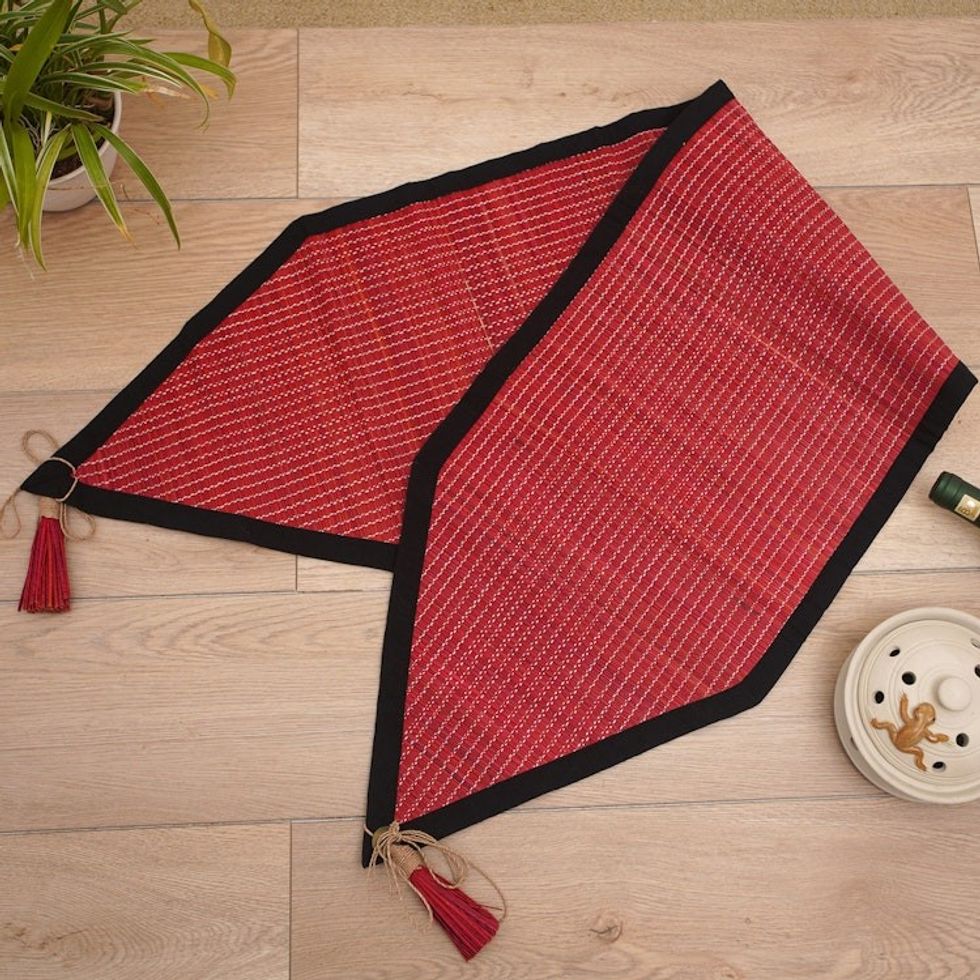 Handcrafted Cotton Blend Table Runner with Geometric Design 'Red Geometry' Item ID: 2671748027