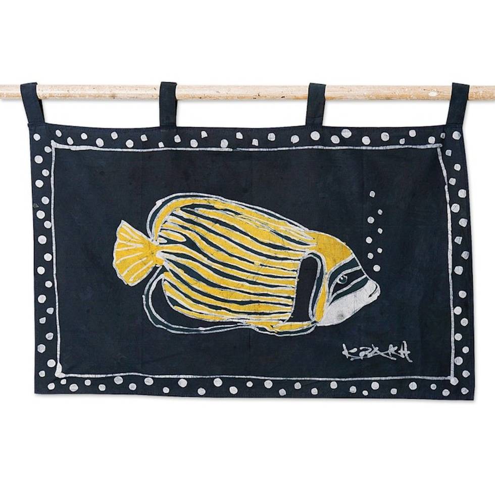 Handcrafted Cotton Wall Hanging of Fish in Black and Yellow 'Night Bubbles' Item ID: 2671803937