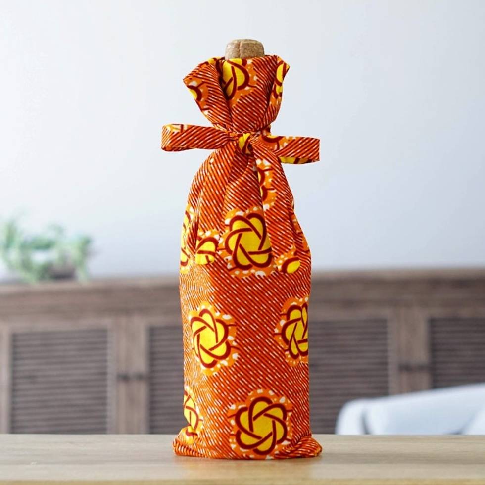 Handcrafted Cotton Wine Bottle Cover in Orange and Yellow 'Happy Toast' Item ID: 2671805391
