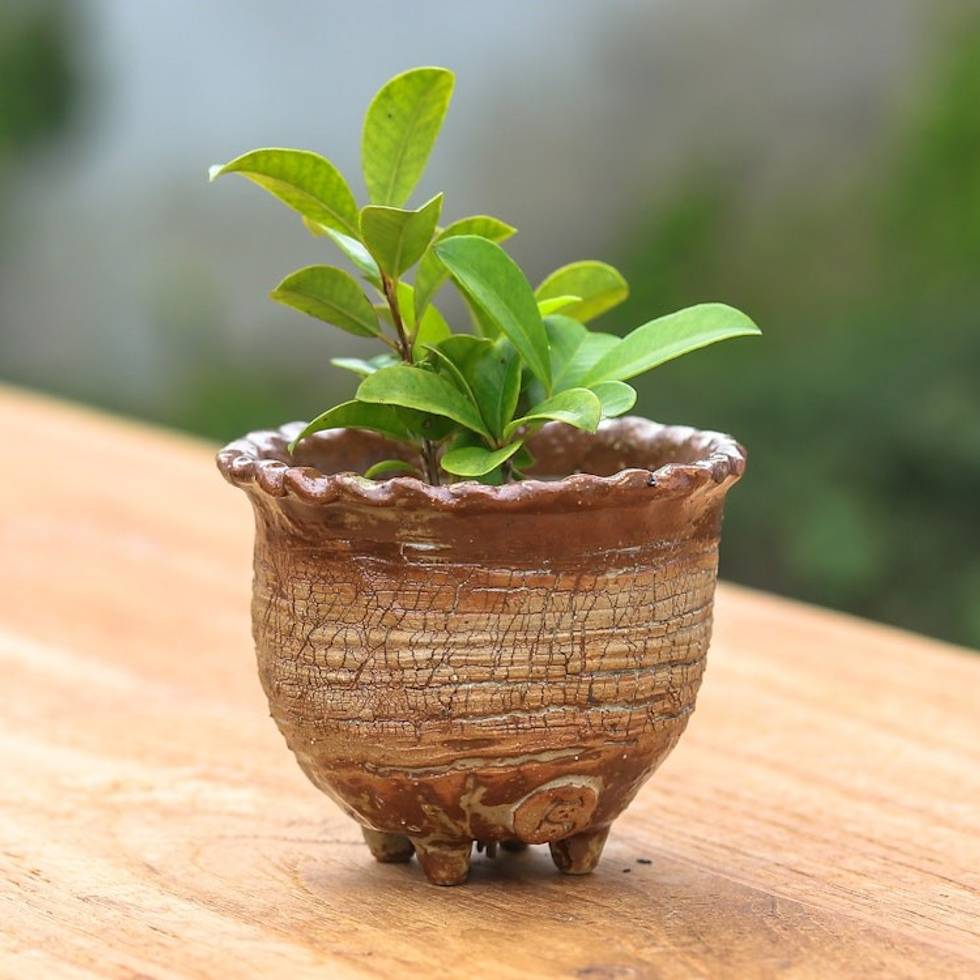Handcrafted Crackled-Finish Earthy Brown Ceramic Flower Pot 'Earth Steps' Item ID: 2671797796
