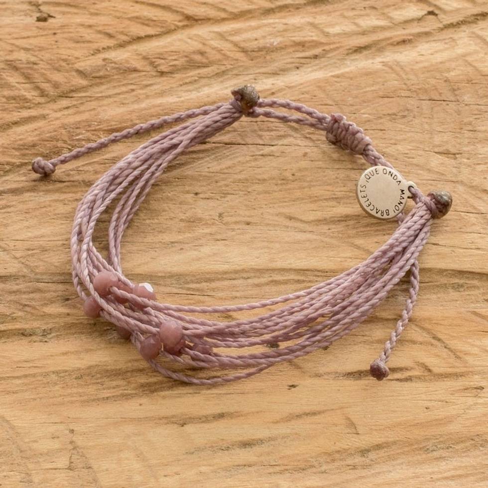 "A dusty lilac tone adds a stylish vibe to Victoria Zurdo's newest creation. Working with waxed polyester cords, the Guatemalan artisan creates a bohemian cord bracelet with little crystal beads embellishing the multiple strands. Furthermore, the design also has a round Zamac charm and sliding knot that allows you to adjust its length."