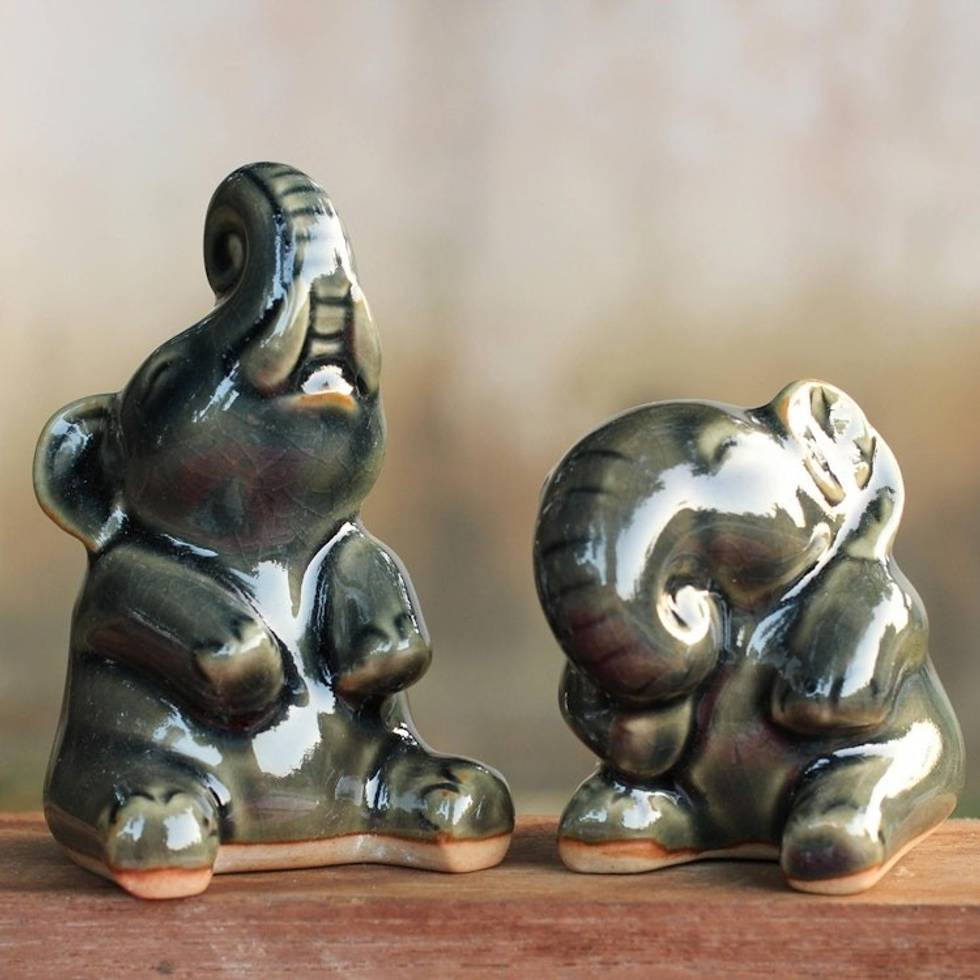 Handcrafted Dark Green Celadon Ceramic Elephants Pair 'Happy Dark Green Elephants' Item ID: 2671802989