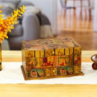 Another "home run" for Ana Maria Gonzales in my book. This small box could be placed almost anywhere and used as a keep-safe for many things, but especially to corral stray jewelry bits and pieces. The interior is plain, stained pinewood, but a bit of cushioning felt could easily be added if desired. I adore the graphic: colorful, bright, happy, and amusing. As with all her boxes (I have five at present and three more on order) the execution is perfect. And I do mean flawless. This is a quality object. The lid fits exact and square, and is securely attached with two perfect brass hinges. The little drawer has a shiny, brass pull, well-secured. The edges of both the lid and the pedestal bottom are double-beveled, and finished in a burnished, antiqued gold. I love this little box--bought it for a gift, but couldn't give it away after it was in my hands.