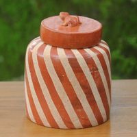 "Women from Lombok Pottery Center create the whimsical design of this jar featuring a frog on the lid. In Indonesia, frogs are believed to bring good luck. The artisans craft the terracotta jar at home and adorn it with diagonal stripes etched freehand, creating a contrast of color and texture.