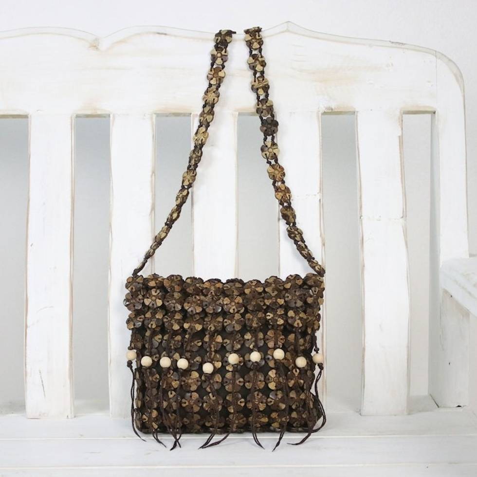 Handcrafted Espresso Brown Coconut Shell Flower Sling 'Shell Chic' Item ID: 2671800781