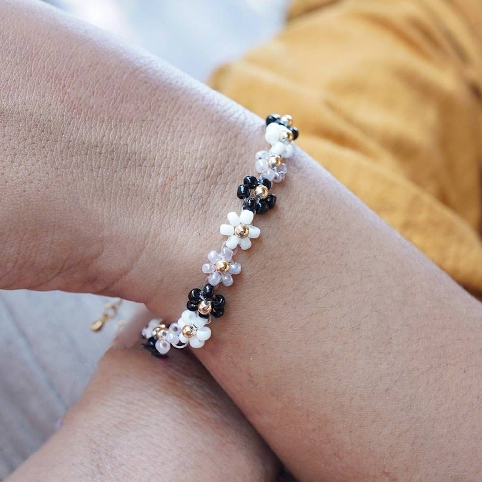 Handcrafted Floral Black and White Crystal Beaded Bracelet 'Classic Petals' Item ID: 2671765314