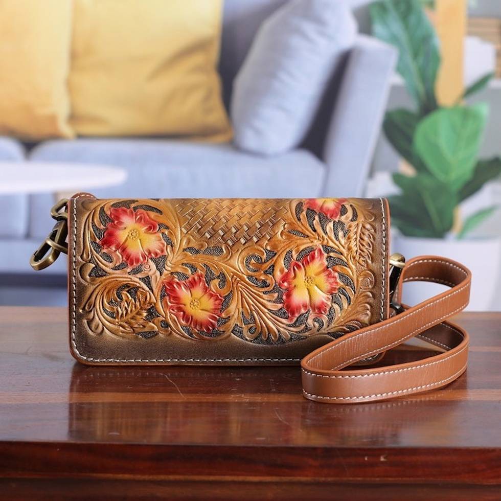 Handcrafted Floral Copper and Caramel Leather Clutch Sling 'Blooming Elation' Item ID: 2671781084