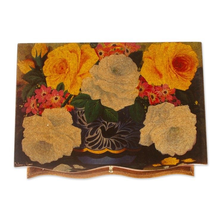 Another wonderful art piece from Ana. The design is gorgeous, especially the couple on the lid celebrating with a bottle of tequila. The colors are so vibrant as is the gold edging on the lid and base. I bought it mostly for show, but the drawer and lid compartment are great for keeping track of small items. Great pine scent from the wood!