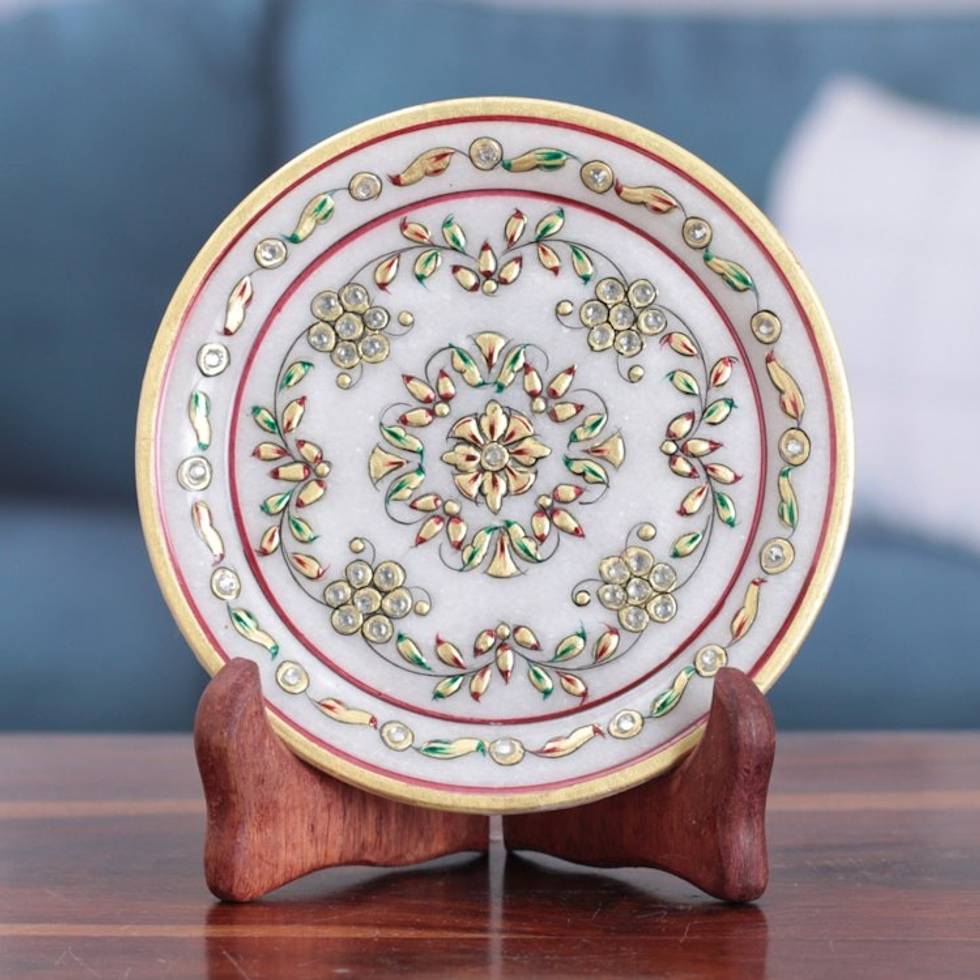 Handcrafted Floral Marble Decorative Plate With Stand 'Regal Blast' Item ID: 2671783027