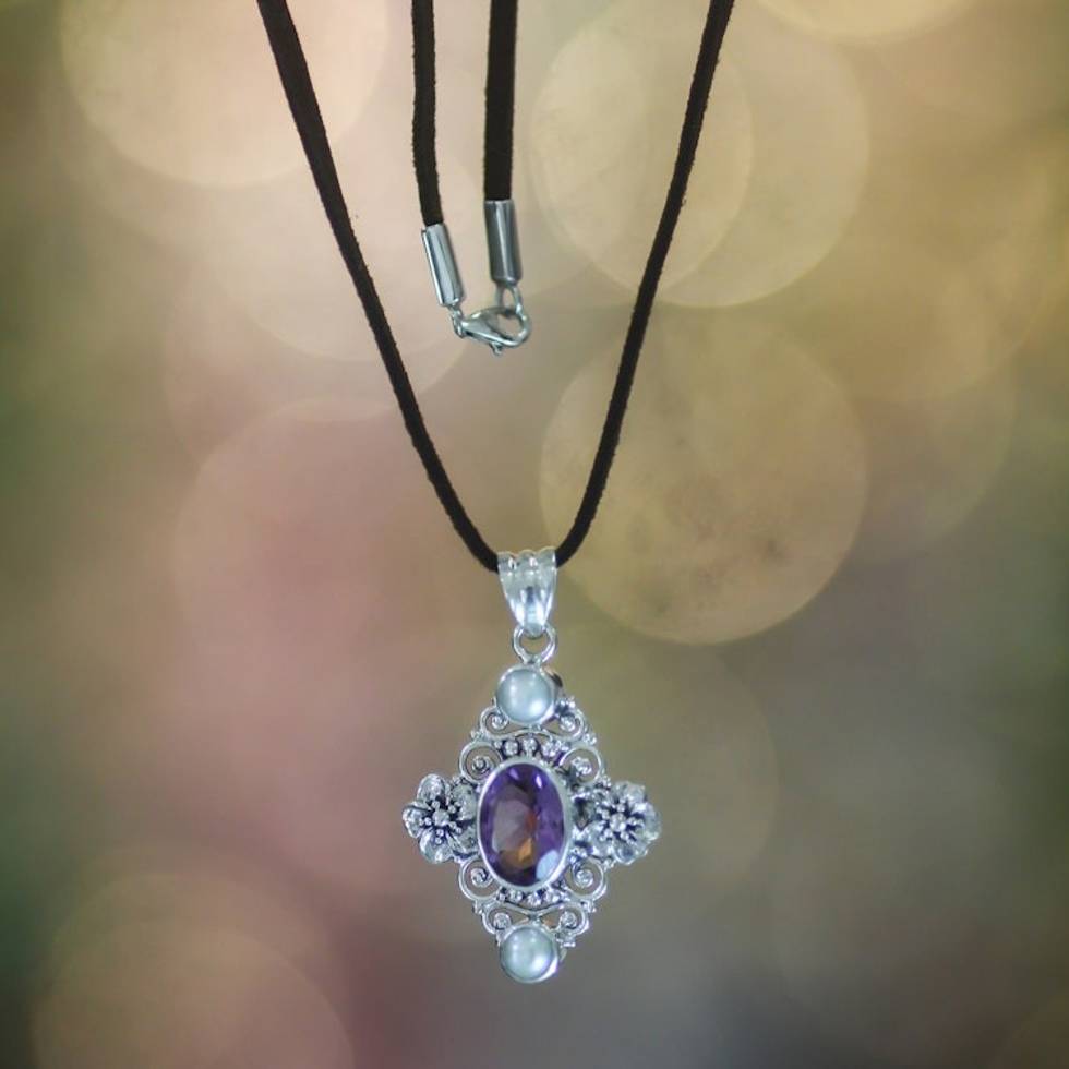 Handcrafted Floral Pearl and Amethyst Silver Necklace 'Frangipani Queen' Item ID: 2671702567