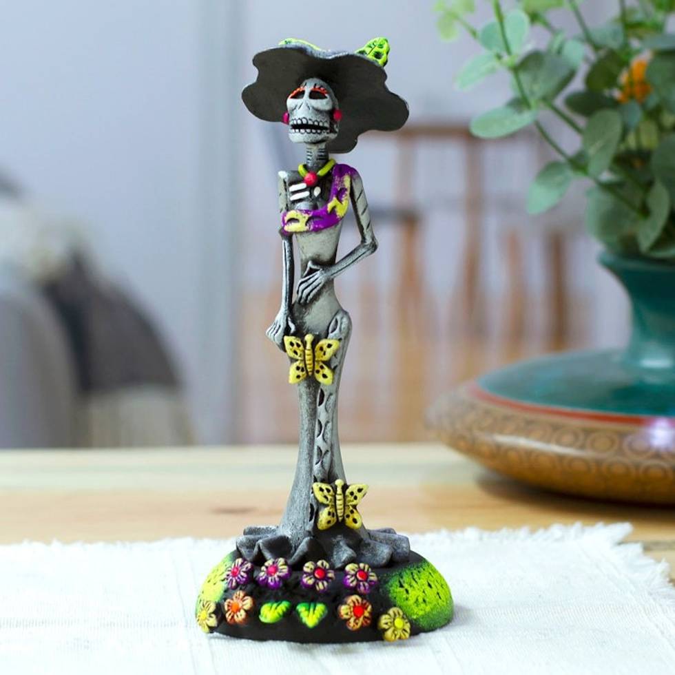 Handcrafted Floral Silver Catrina Sculpture on Floral Base 'The Eternal Catrina' Item ID: 2671807887