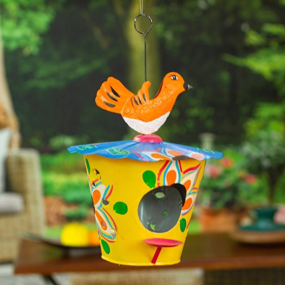 Handcrafted Floral Tin Birdhouse and Feeder with Orange Bird 'Dawn Chants' Item ID: 2669897399