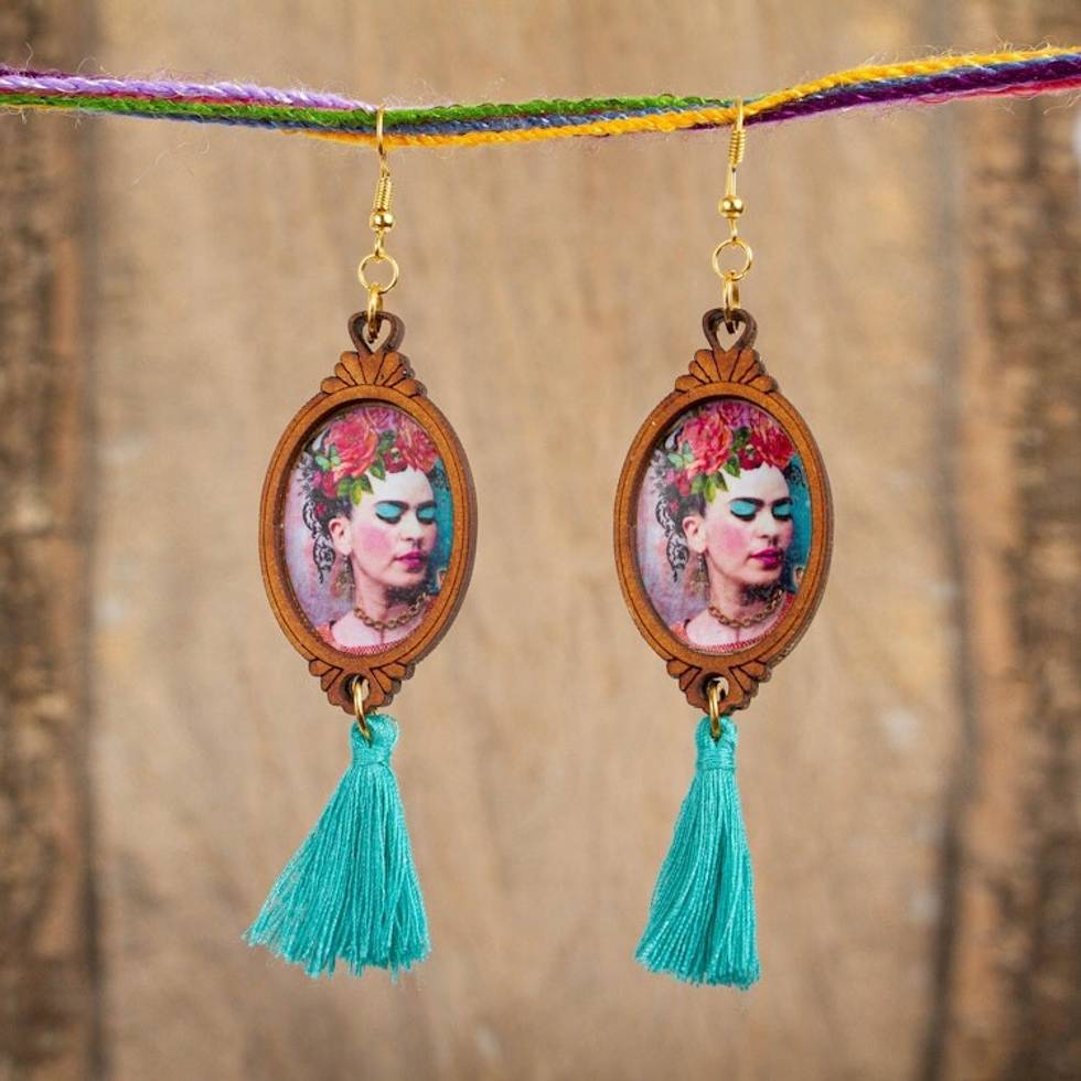 Handcrafted Frida Kahlo Wood Dangle Earrings Aqua Tassels 'Brilliant Frida' Item ID: 2669931838