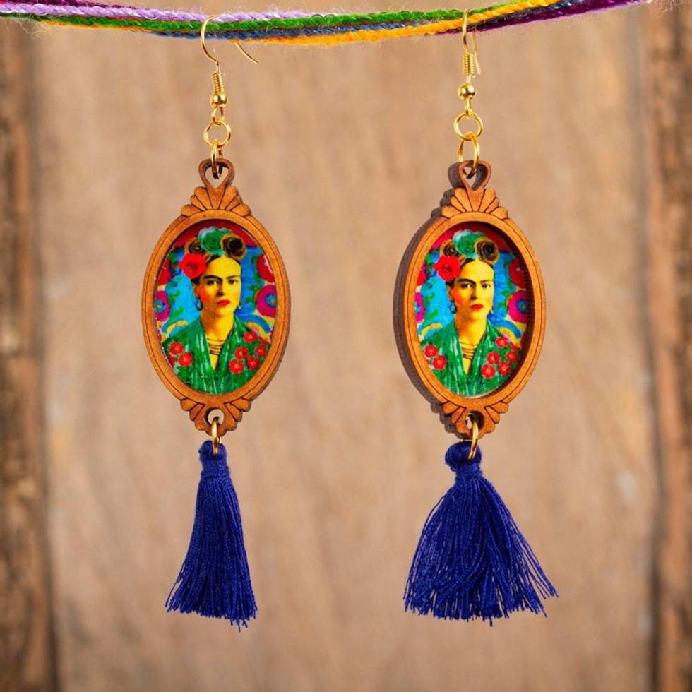 Handcrafted Frida Kahlo Wood Dangle Earrings Blue Tassels 'Frida with Roses' Item ID: 2669931126