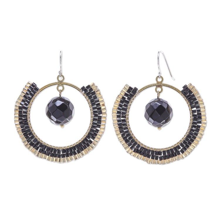 Handcrafted Glass Beaded Circle Earrings 'Universal Sun in Black' Item ID: 2671800394