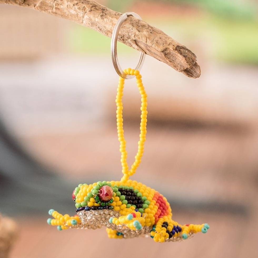 Handcrafted Glass Beaded Frog Keychain in Yellow Hues 'Leaping Yellow' Item ID: 2669933622