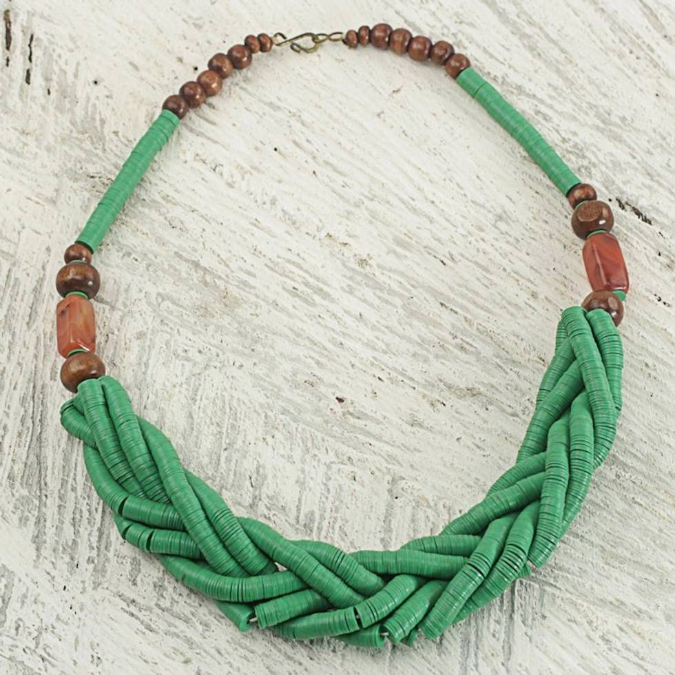 Handcrafted Green Braided Bead Necklace with Wood and Agate 'Sosongo in Green' Item ID: 2671800871