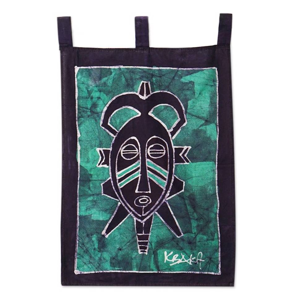 "Ghanaian artist K. Baka handcrafts a stunning cotton wall hanging, drawing inspiration from the traditional masks of his culture. Using a palette of black and green tones, the artisan creates each little detail, titling the work Bisa, meaning 'ask' in the Akan language."