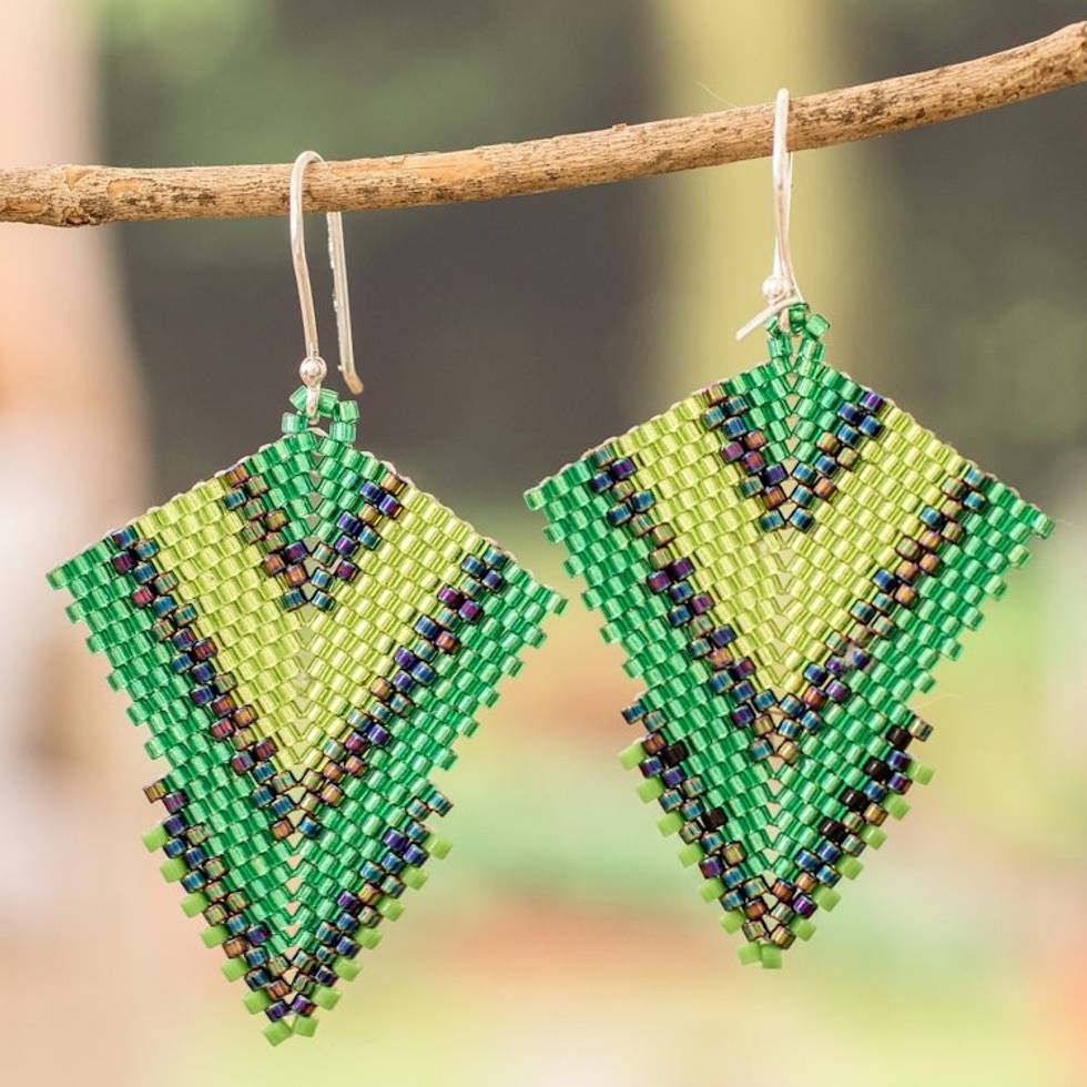 "Artisans from the Hands of Atitlan take inspiration from classic jewelry arts to create a sublime fashion statement boasting the Guatemalan region's unique essence. The team uses glass beads to create these dangle earrings, whose geometric shape is enriched by a combination of green hues. Made for a vibrant soul, the pieces are also equipped with sterling silver hooks."