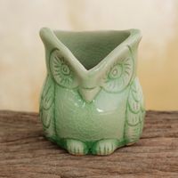 Handcrafted Green Thai Celadon Bird Theme Pot 'Happy Green Owl' Item ID: 2669897439