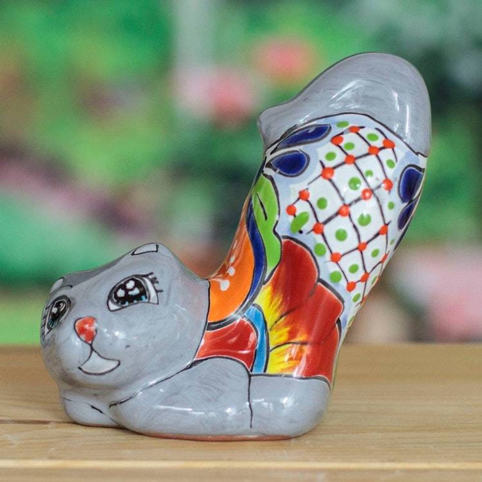 Handcrafted Hacienda-Themed Grey Ceramic Cat Figurine 'Feline Stretching' Item ID: 2676647185