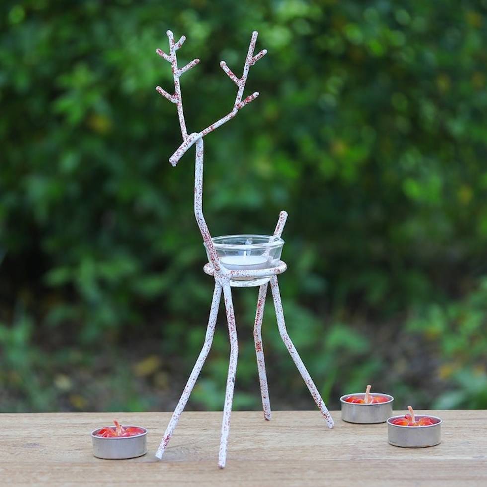 Handcrafted Iron Reindeer Tealight Holder in White and Red 'Winter Reindeer in Red' Item ID: 2671797325
