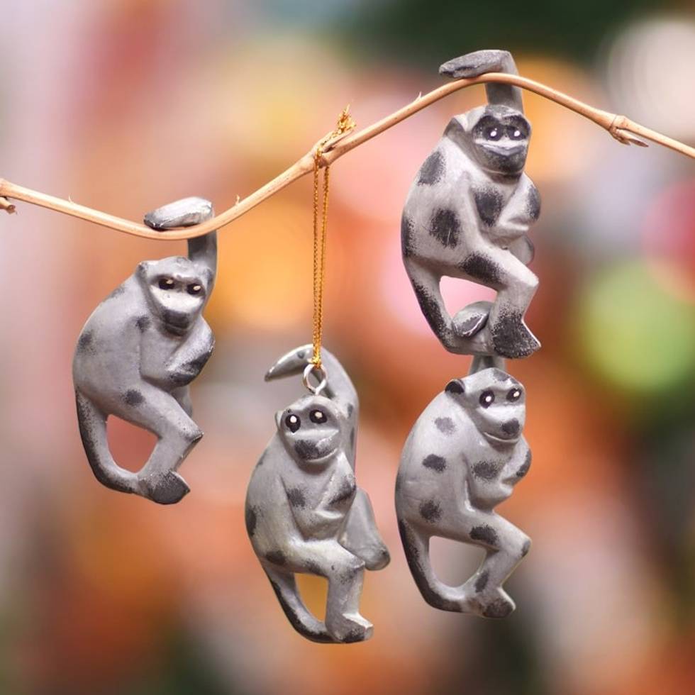Handcrafted Jempinis Wood Monkey Ornaments Set of 4 'Jungle Celebration' Item ID: 2671763455