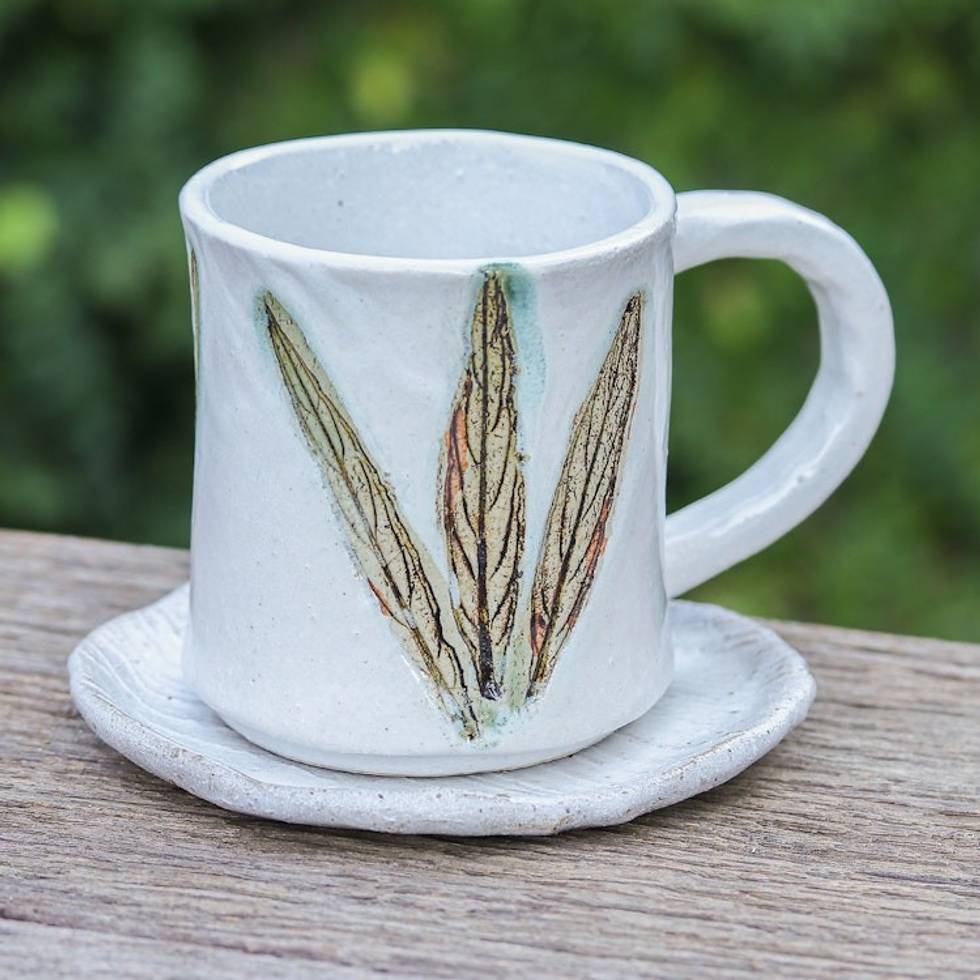 Handcrafted Leaf-Themed Ceramic Mug and Saucer Set 'Lovely Leaves' Item ID: 2671797791