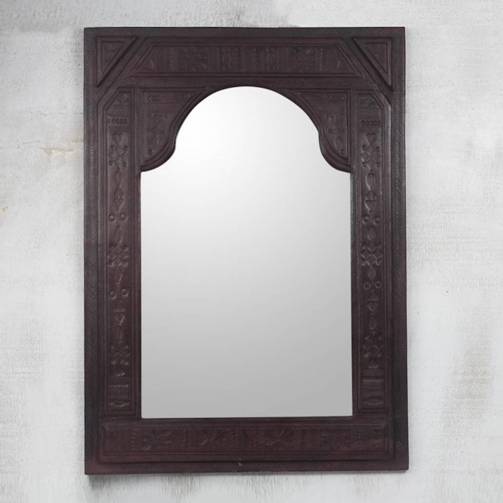 "Flanked by columns, an arched doorway provides a peek into the palace. Fascinating textures in tooled leather surround this mirror by Mohammed Sckeek. Embossed by hand, it covers a frame carved of sese wood."
