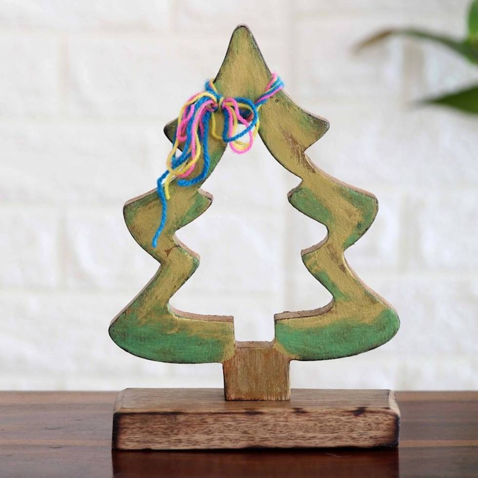Handcrafted Mango Wood Christmas Tree Sculpture from India 'Joyful Present' Item ID: 2671786954