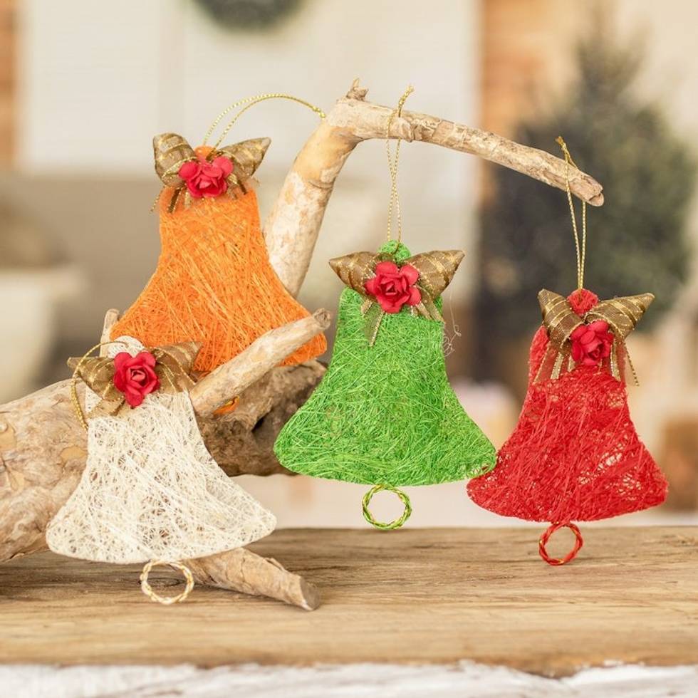 Handcrafted Natural Fiber Bell Holiday Ornaments Set of 4 'Joyous Bells' Item ID: 2671779331