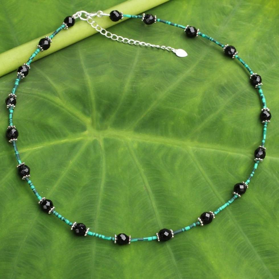 Handcrafted Onyx, Calcite and Sterling Silver Choker 'Floral Nights' Item ID: 2669931373