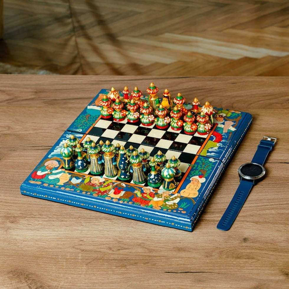 Handcrafted Painted Walnut Wood Chess Set in Teal 'Teal Bukhara Folklore' Item ID: 2669935064