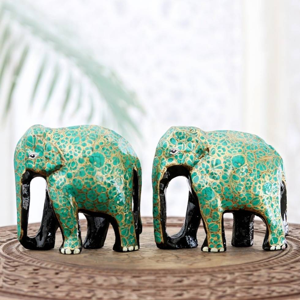 Handcrafted Papier Mache Elephant Statuettes Pair 'Bond of Friendship in Green' Item ID: 2671787620