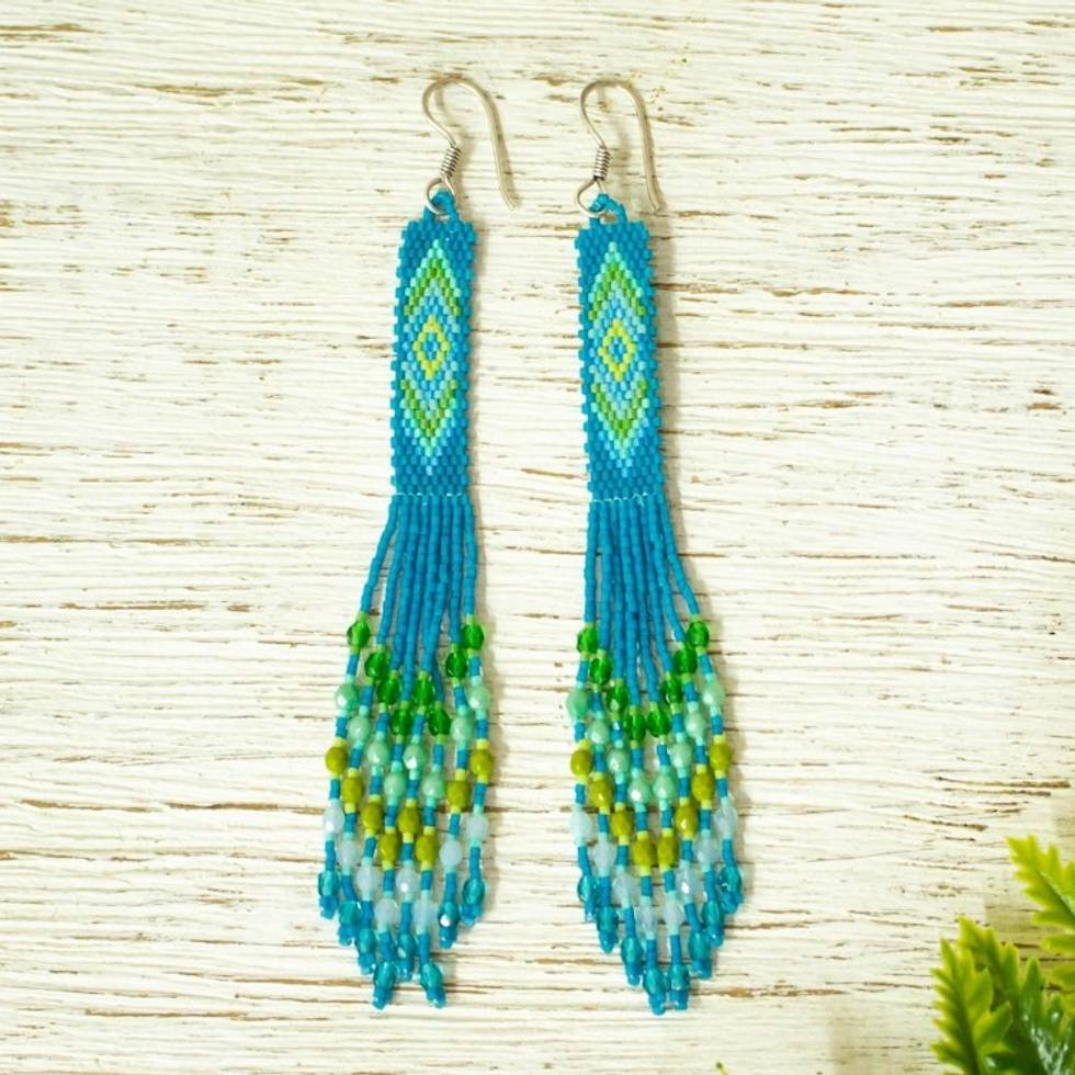 Handcrafted Peacock Blue Beadwork Huichol Waterfall Earrings 'Blue Diamond Talisman' Item ID: 2669931086