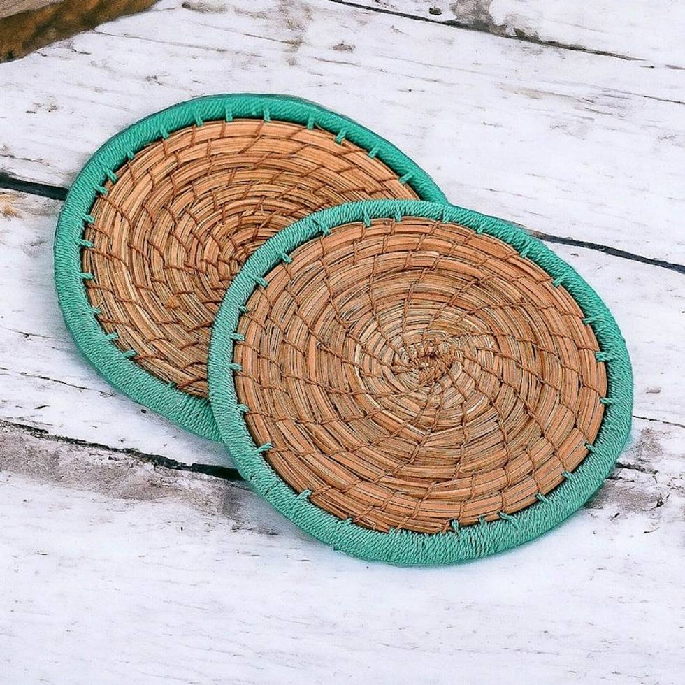Handcrafted Pine Needle and Polyester Green Coasters Pair 'Latin Toast in Green' Item ID: 2671626539